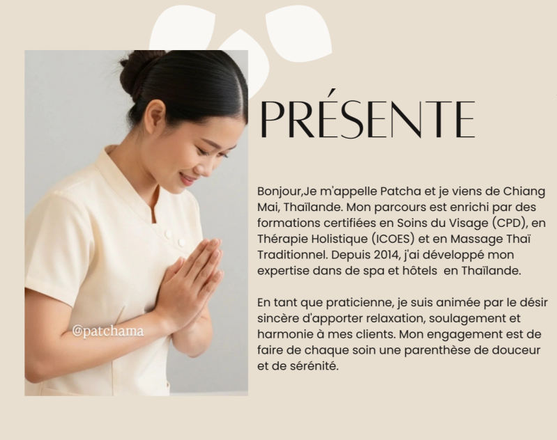 Nous proposons divers types de massages, massage aux huile aromathérapie, massage thaï mix technique traditionnel. massage du visage, ( serious et professionnel )